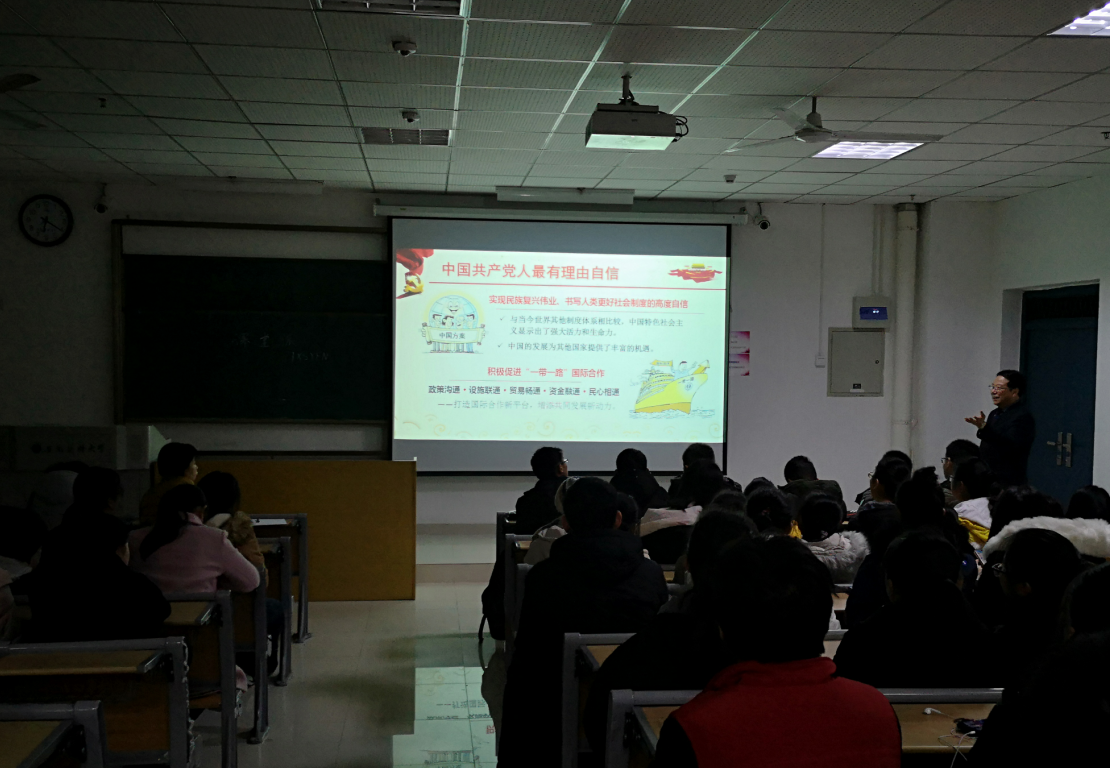 王怀才从走进共产党人的初心、新时代党的历史使命、中国共产党最有理由自信、从严治党开创未来四个方面详细讲解了共产党人的“初心”和“使命”,从南湖红船上寻找光明的摆渡人到烽火硝烟中挺立脊梁的主心骨,到驾驭世界第二大经济体的领航员,中国共产党始终初心不改、壮志不变,那就是“为中国人民谋幸福、为中华民族谋复兴”。报告通过展示改革开放以来国家取得的辉煌成就进一步说明了中国特色社会主义制度的优越性和中国共产党的正确领导。王怀才希望在校大学生以习近平新时代中国特色社会主义思想为指引,不忘初心、牢记使命,牢固树立“四个意识”,坚定“四个自信”,埋头苦干、改革创新,为实现中华民族伟大复兴的中国梦做出自己的努力!