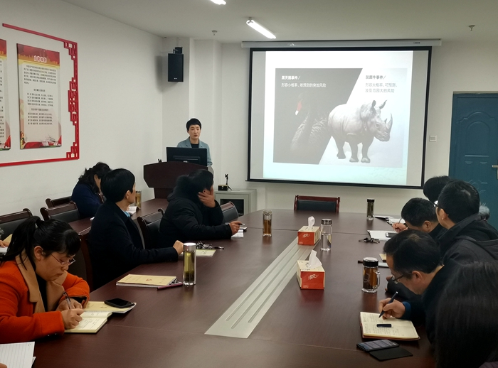 该院党委书记潘莉莉主持会议并首先传达了学校培训部署着力防范化解重大风险专题工作会议精神。就抓好学院风险防控和工作贯彻落实,她作了“学习贯彻习近平总书记重要讲话精神,坚持底线思维应对化解重大风险挑战”的专题培训,从“黑天鹅”和“灰犀牛”的概念及引申义中,要求全体同志既能在重大风险面前坚定政治站位,树牢信念信心,又要增强忧患意识,居安思危,以高度的政治责任感和敏锐感警惕潜在风险,提高化解能力。要坚持底线思维,从容面对学院深化改革发展过程中的挑战和藩篱,着力解决突出矛盾和问题,党员干部带头作为,压实工作责任,凝心聚力保障和谐稳定的发展大局。