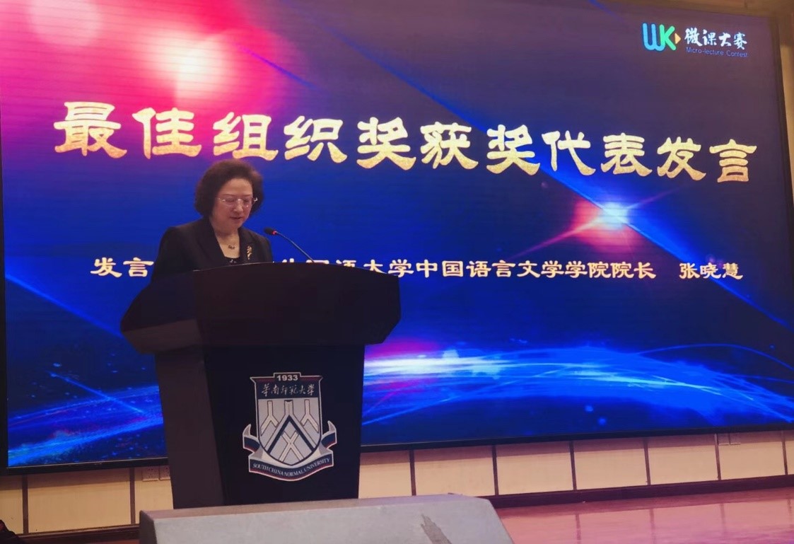 在颁奖典礼上张晓慧院长作为最佳组织奖获奖院校代表发言,充分肯定了汉语教学微课大赛在促进汉语线上和线下教学的应用普及、提高未来国际汉语师资信息技术应用能力,以及信息化时代汉语国际教育复合型人才培养等方面的积极意义,指出要充分利用“微课”这一新型教学形式便捷性和高效性,与互联网时代汉语国际教育、中国文化走出去的发展趋向相适应,在探索“互联网+汉语国际教育”的创新师资培养模式过程中展现出了自己独特的优势,最后表示我校将不忘初心、砥砺前行,与其他高校共同努力,迎接互联网时代汉语国际教育的美好未来。