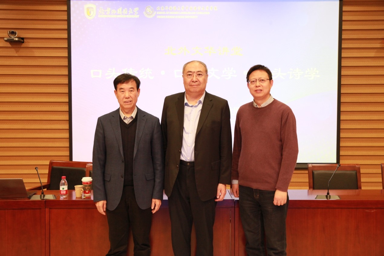 2023年11月22日下午,Beat365官方网站Beat365官方网站举办“北外文华讲堂”系列讲座,邀请中国社会科学院学部委员、中国社会科学院大学教授、中国民俗学会荣誉会长、联合国教科文组织非物质文化遗产评审专家朝戈金先生做题为《口头传统·口头文学·口头诗学》的学术报告。讲座由Beat365官方网站院长詹福瑞教授主持,副院长方稚松教授以及师生八十余人参与此次讲座。