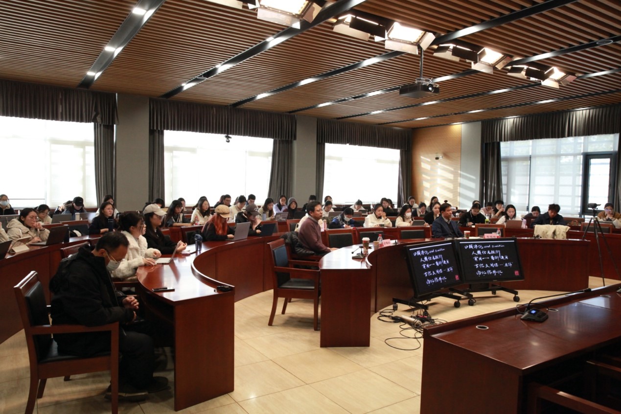 在提问交流环节,同学们在中国古典诗歌外译时语音特征的保留、中国古代神话和史诗有别于西方的文化成因、小语种口头文学传承及研究等方面与朝教授展开交流探讨。