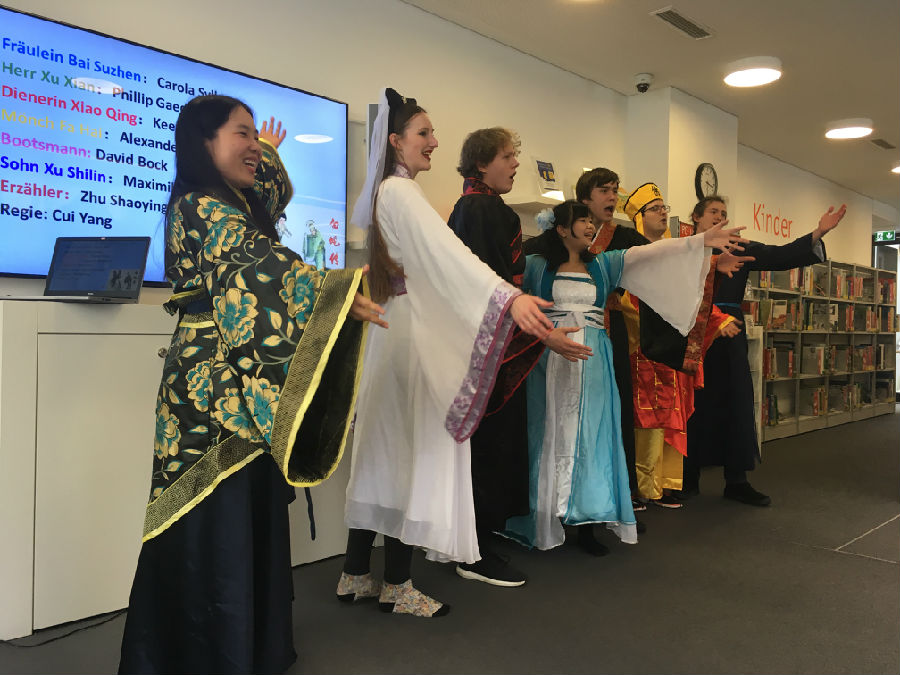 慕尼黑孔子学院为此邀请了埃尔兰根大学汉学系戏剧社的演员们在慕尼黑城市图书馆为现场近20名观众表演了中国经典民间传说《白蛇传》,该剧由七名汉学系的学生编排和表演,不仅真实还原了剧情和人物性格,还在此基础上增加了一些诙谐幽默的流行网络用语,加上演员们轻松自然的表演方式,逗得现场观众哈哈大笑,在场的小朋友也被剧情深深吸引,看得如痴如醉。此外,活动现场还设有中国传统书法体验项目,众多小朋友跟家长一起切身体验了传统书法的魅力,留下了亲子间美好的回忆。