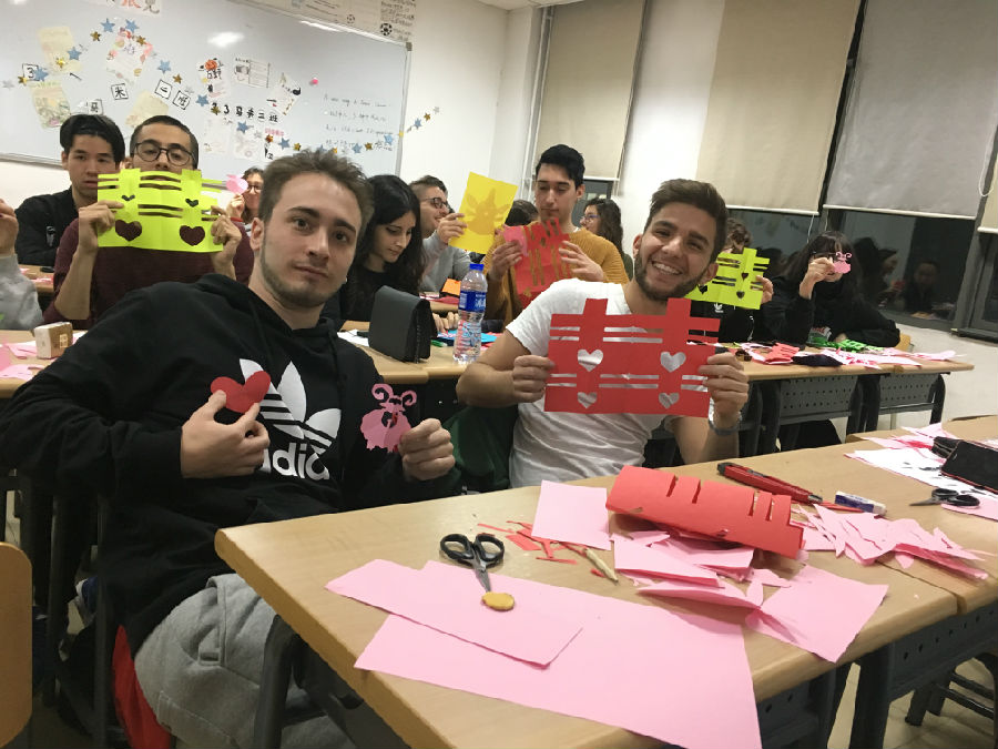 2017年12月8日晚上,Beat365官方网站对外汉语系罗马班的学生在309教室开展了中国剪纸艺术体验课。体验课在王老师的剪纸文化介绍中开始,她用生动详实的PPT,为同学们概述了剪纸的发展历史、作品种类和样式。老师讲解后,同学们进入到实际操作的环节。同学们从最简单的小桃子开始剪起,后来在老师的帮助下剪出了羊、熊猫、大象等图片,最后大家每个人都剪出了一个大大的“囍”字。通过这次剪纸体验课,同学们不仅了解了中国传统文化知识,而且体验到剪纸艺术精致的美感,更激发了他们对中国文化的兴趣和学习汉语的热情。