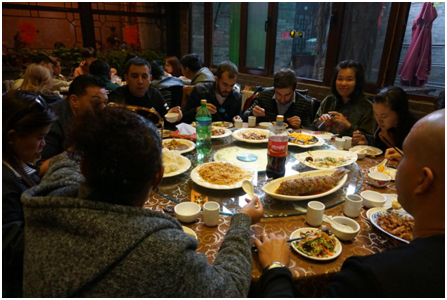 ??到了天津已近中午,学员们品尝了工作人员精心准备的中式菜肴,导游还为学员们介绍了中国的餐桌礼仪,引得大家赞不绝口。??