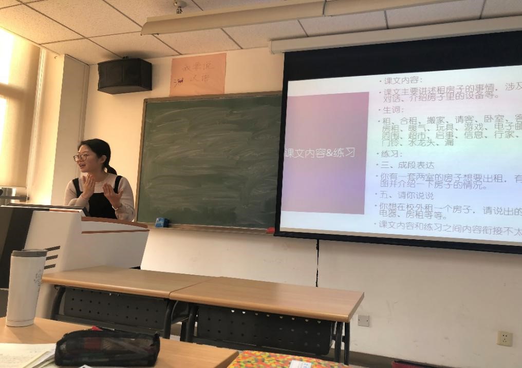 A班郭娜老师采用图片法、情景法,与在场老师互动,声情并茂地展示了“你干什么呢”这一语言点的讲解与操练。 C2班马赟鹤老师重视口语表达的交际性。对课文《我在校外租了房子》做了二次开发。补充相关常用词语,加入影视片段节选,使学生对这一主题有了更加直观的认识。课后给学生布置了语言实践型任务,突出了语言在生活中的交际功能。