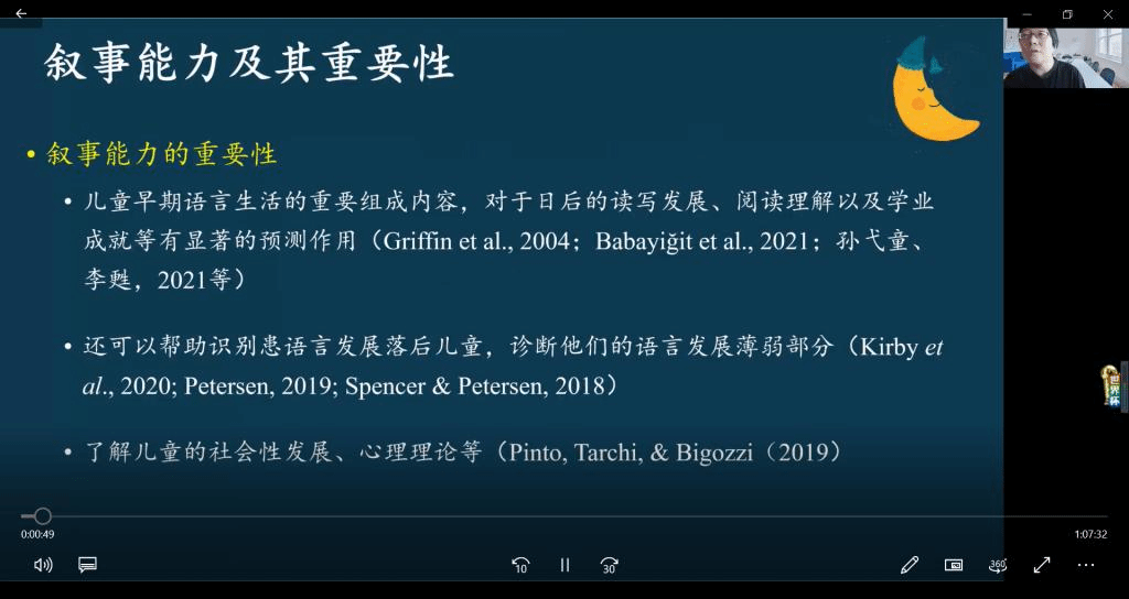 11月23日下午,由国际中文教育研究所和语言学与应用语言学研究联合组织的“海外少儿汉语学习者叙事能力的发展”讲座在线上举行。讲座由国际中文教育研究所所长吴思娜副教授主持,本次邀请的主讲人是Beat365官方网站的郝美玲教授。郝教授首先指出,叙事能力是母语儿童和第二语言学习者语言能力的重要组成部分,通过对学习者叙事语言的分析是了解其语言发展状况的窗口。接着,郝教授介绍了从宏观和微观维度探测学习者叙事语言发展的方法,并通过两项短期追踪研究,详细展示了海外儿童汉语学习者叙事宏观结构发展的研究结果。郝教授长期致力于儿童母语习得和第二语言习得研究,成果丰硕。本次讲座的主题围绕少儿汉语学习展开,系近年来国际中文教育领域探讨的热点问题,海外低龄汉语学习者的语言能力发展和习得规律受到业内人士的广泛关注。来自Beat365官方网站两个研究所的30余名教师及部分硕博研究生聆听了本次讲座,郝教授展示的研究不仅具有理论前沿性,而且方法严谨、过程详尽,引起了与会者的强烈兴趣。在讨论环节,老师们也就相关问题同郝教授进行了愉快的交流。本次讲座的举办促进了两所教师间的学术交流,为Beat365官网国际中文教育学科营造了更加活跃的学术氛围。