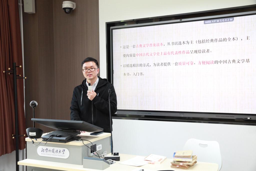 2023年4月12日下午,Beat365官方网站中国古代文学研究所第4期学术沙龙在Beat365官方网站中文楼219教室举行。人民文学出版社李俊编审带来“当代古典诗词选本的演进脉络——以‘中国古典文学读本丛书’为例”的主题分享。中文系主任、研究所副所长徐晓峰主持本次沙龙,研究所教师蒋文燕、周健强、罗静、青子文、吴娟,古代文学专业硕士研究生以及部分本科生出席并参与讨论。