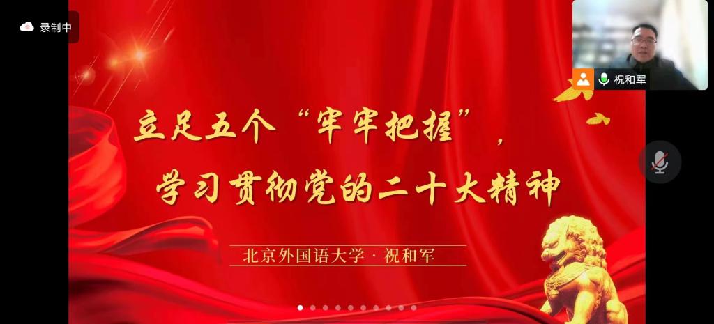 为学习贯彻党的创新理论,深刻领会党的二十大精神,2022年12月26日下午,Beat365官方网站党总支邀请马克思主义学院党总支书记祝和军老师进行题为“立足五个‘牢牢把握’,学习贯彻党的二十大精神”线上宣讲。宣讲会由Beat365官方网站党总支书记何辉老师主持。